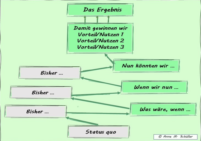 Wer etwas verändern will, setzt beim Bestehenden an. Ausgehend vom einstmals Bewährten werden dann Trittsteine gelegt, um den Weg zum besseren Neuen sicher zu machen. Hierfür habe ich einen Argumentationsleitfaden entwickelt, zu dem mich das Design Thinking angeregt hat: die „So-oder-So-Argumentation“. Die Abbildung zeigt, wie sie funktioniert: Zunächst erläutern Sie den anwesenden Entscheidern den Status quo und nennen einen Nachteil. Danach nennen Sie eine Was-wäre-wenn-Alternative. Dann kommt ein zweiter Bisher-Nachteil, danach eine Wenn-wir-nun-Alternative.